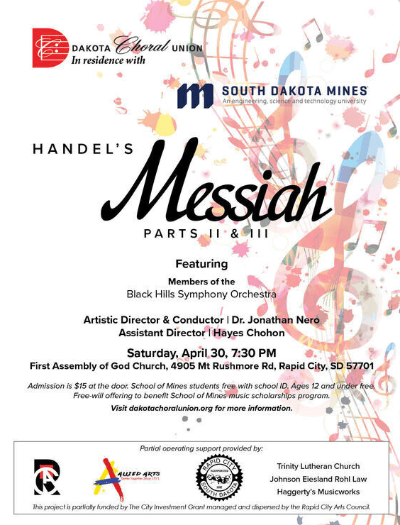 Dakota Choral Union in residence with South Dakota School of Mines & Technology’s University Choir presents Handel’s Messiah Parts II & III on Saturday, April 30, at 7:30 p.m., First Assembly of God Church, 4905 Mt. Rushmore Service Road, Rapid City, SD. The concert, under the direction of Artistic Director Jonathan Nero and Assistant Director Hayes Chohon, also features members of the Black Hills Symphony Orchestra. Admission is $15 at the door, free for children ages 12 and younger and for School of Mines students with school ID. A free-will offering benefits the School of Mines music scholarships program. Go to dakotachoralunion.org for more information.