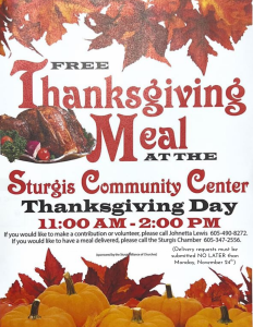 If you would like to attend in-person, the meal will take place on Thanksgiving Day from 11AM to 2PM at the Sturgis Community Center.